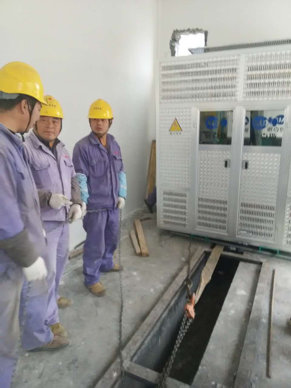 2016年,12月11日,因精业太阳能有限公司增容需求,在电缆及高低压柜到现场的情况下,我公司对其进行了现场下柜和下电缆。由于现场条件不是很理想,工作负责人对班组人员进行了分工。首先一部分班组成员在安全负责人的监督下,做好必要的安全措施,有序的在工作负责人的安排下,暂时的把高低压柜放在了车间。由于配电房地基改造不完善,一部分班组成员进行了现场的焊接工作及对地坪进行了平整。
